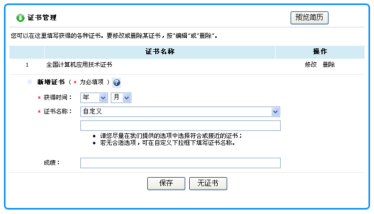 1)進(jìn)入"個(gè)人管理中心",位于左側(cè)子欄目的"簡歷維護(hù)",點(diǎn)擊"個(gè)人證書管理"。