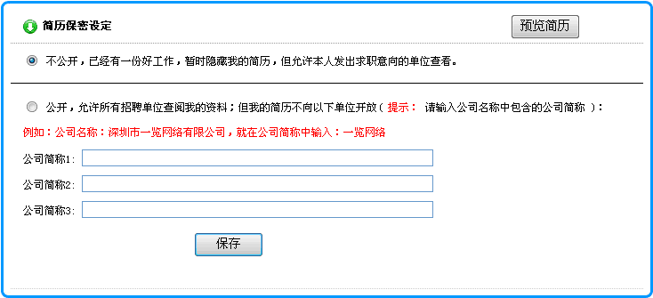 2)在打開的頁面中,選擇 公開,允許所有招聘單位查閱我的資料;但我的簡歷不向以下單位開放( 提示: 請(qǐng)輸入公司名稱中包含的公司簡稱 ):按下圖所示,對(duì)號(hào)入座填入信息,點(diǎn)擊保存按鈕即可.